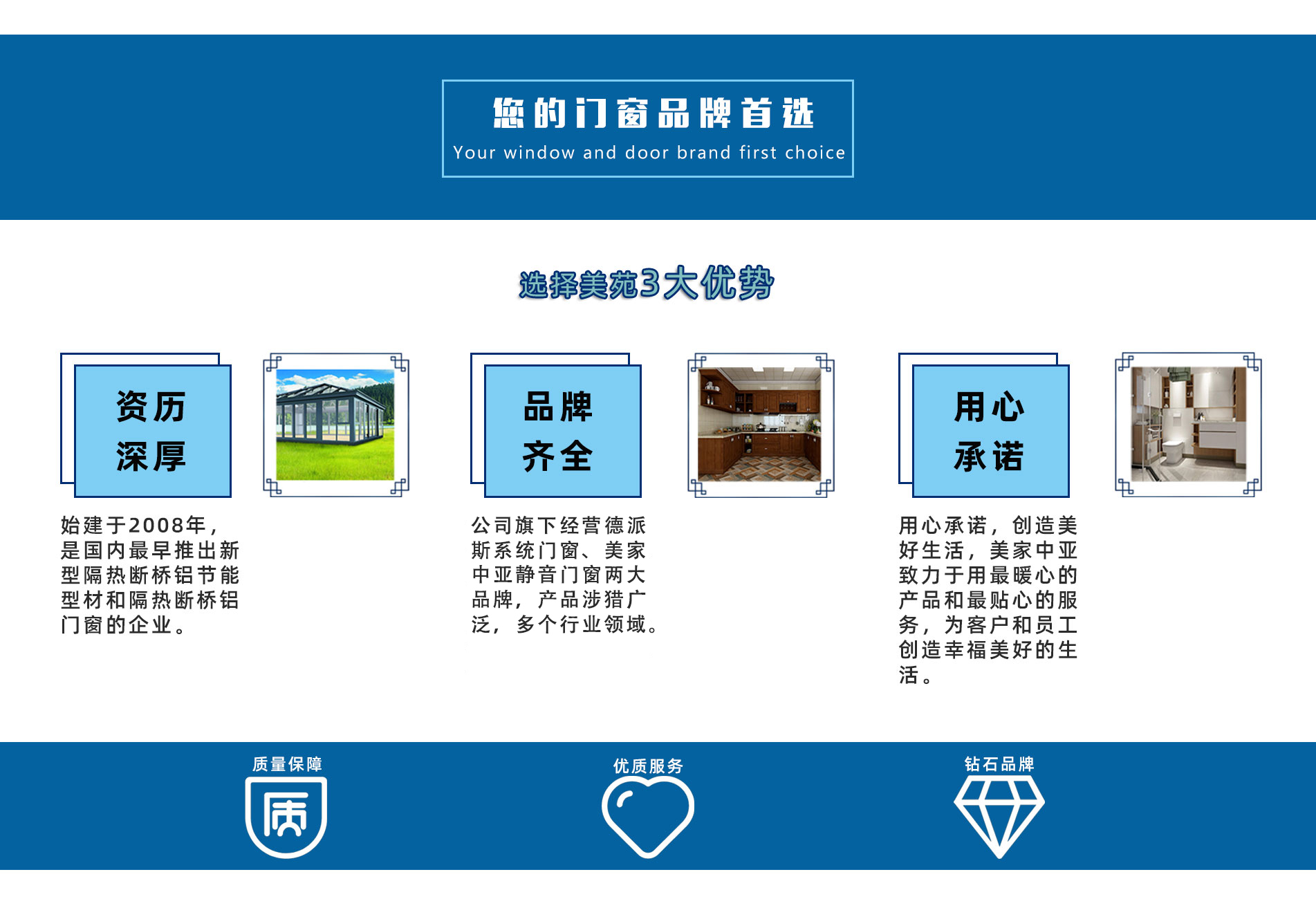 美家中亞(天津)科技有限公司前身為天津美苑斷橋鋁門窗有限公司,始建于2008年,是國內早期推出新型隔熱斷橋鋁節能型材和隔熱斷橋鋁門窗的企業。公司旗下經營德派斯系統門窗、美家中亞靜音門窗兩個品牌,產品涉及斷橋鋁門窗、系統門窗、無縫焊接門窗、門窗建筑工程、智能家居、定制全鋁家裝設計等多個行業領域。用心承諾,創造美好生活,美家中亞致力于用暖心的產品和貼心的服務,為客戶和員工創造幸福美好的生活。美家中亞,以客戶體驗為使命,以產品品質為根本,在低碳、環保、科技創新下,將好門窗帶入千家萬戶!